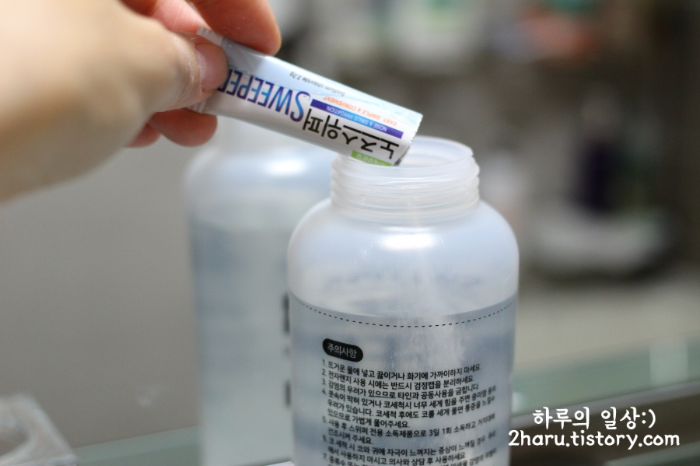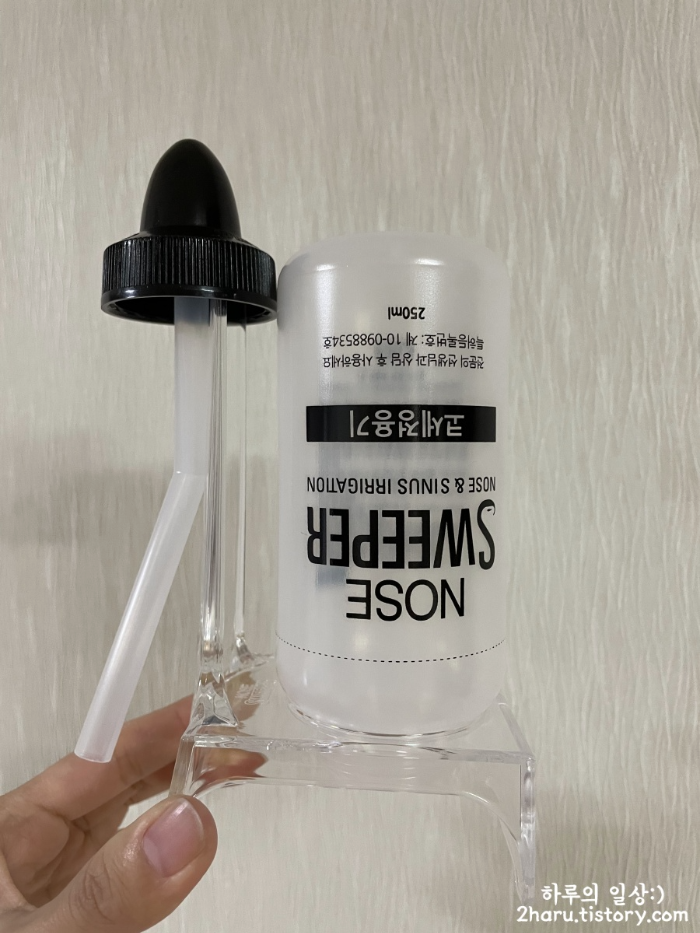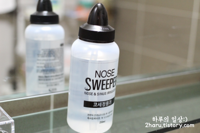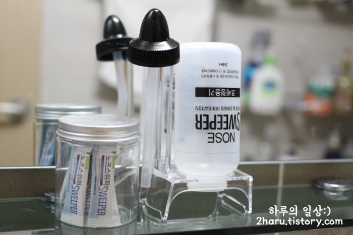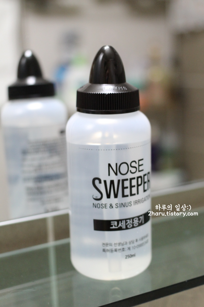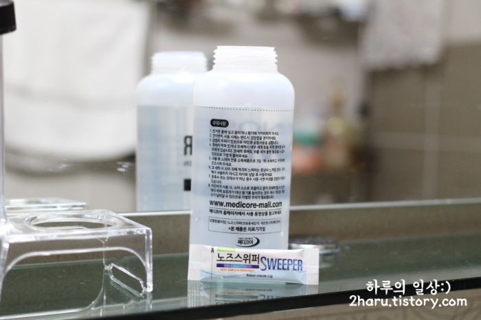 코 세척기 노즈스위퍼를 욕실에 바로 가져가서 세척 후 말린 뒤 사진을 찍어보았습니다. 예전 미국 네일메드를 사용할 때는 거치대가 따로 없고 입구가 좁아서 분말을 넣다가 흘리기도 많이 흘리고 잘 안말라서 좀 별로였어요. 이상민 코 세척기로 유명한 노즈스위퍼는 입구가 넓어서 분말이 흘릴 일이 없고, 건조에도 더 용이하고 그리고 무엇보다 호스 자체가 꺽여있어서 통을 기울지 않아도 코 세척을 쉽게 할 수 있는 장점이 있답니다. 따뜻한 물을 사용해 주시는게 좋구요. 생수나 정수기 물을 담아 전자렌지를 돌리기도 하던데 저는 그냥 따뜻한 물을 점선까지 담아서 부어주면 됩니다. 가루도 손쉽게 뜯을 수 있어서 부어주면 된답니다. 잘 흔들어 섞어 준 다음에 고개를 살짝 꺽어서 코에 넣고 쭉 짜주면 된답니다. 자세한 설명은 밑에 동영상으로 설명해드릴게요.