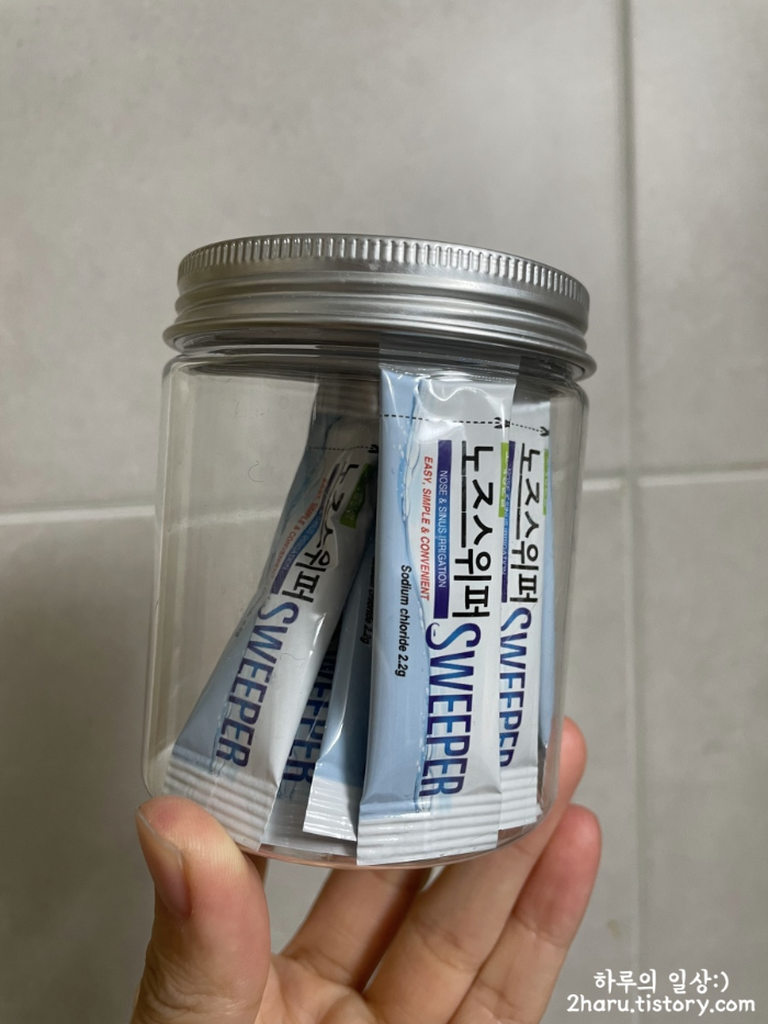 간단하게 상자에 휴대용파우치까지 들어있는데 파우치는 바로 버렸어요. 휴대용으로 들고 다닐 건 아니라서 욕실에 놓고 쓸 예정입니다. 예전 미국 네일메드 코 세척기는 그냥 통만 있었는데 노즈 스위퍼는 호스 세척 솔 까지 주셔서 더 세심하다고 느껴졌어요. 호스 세척을 할 수가 없어서 좀 찝찝함이 있었는데 개운하게 세척할 수 있을 것 같아요. 분말은 딱 10개가 들어있는데 저는 통에 보관을 하려고 바로 통에 넣었답니다. 다이소에서 구입한 화장품 소품 통인데 코 세척 분말 사이즈가 딱 이더라고요.