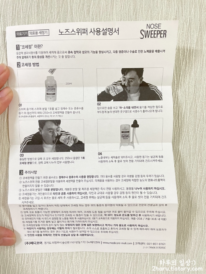 이비인후과에서 비염약을 타면서 이비인후과 전문의 선생님이 코 세척을 자주 해주는 게 좋다고 설명을 해주셔서 비염 처방약 사면서 약국에서 같이 구입했어요. 노즈스위퍼 분말은 10개 들었고, 거치대까지 있는 제품으로 11,000 원주고 구입했지요. 예전에 미국 제품 네일 메드 제품을 해외 직구해서 사용을 하다가 어느 순간 사용하지 않게 되어 이사 오면서 버렸는데 이번에는 한국 제품인 이상민 코 세척으로 유명한 코 세척기 노즈스위퍼 리뷰해드릴게요.